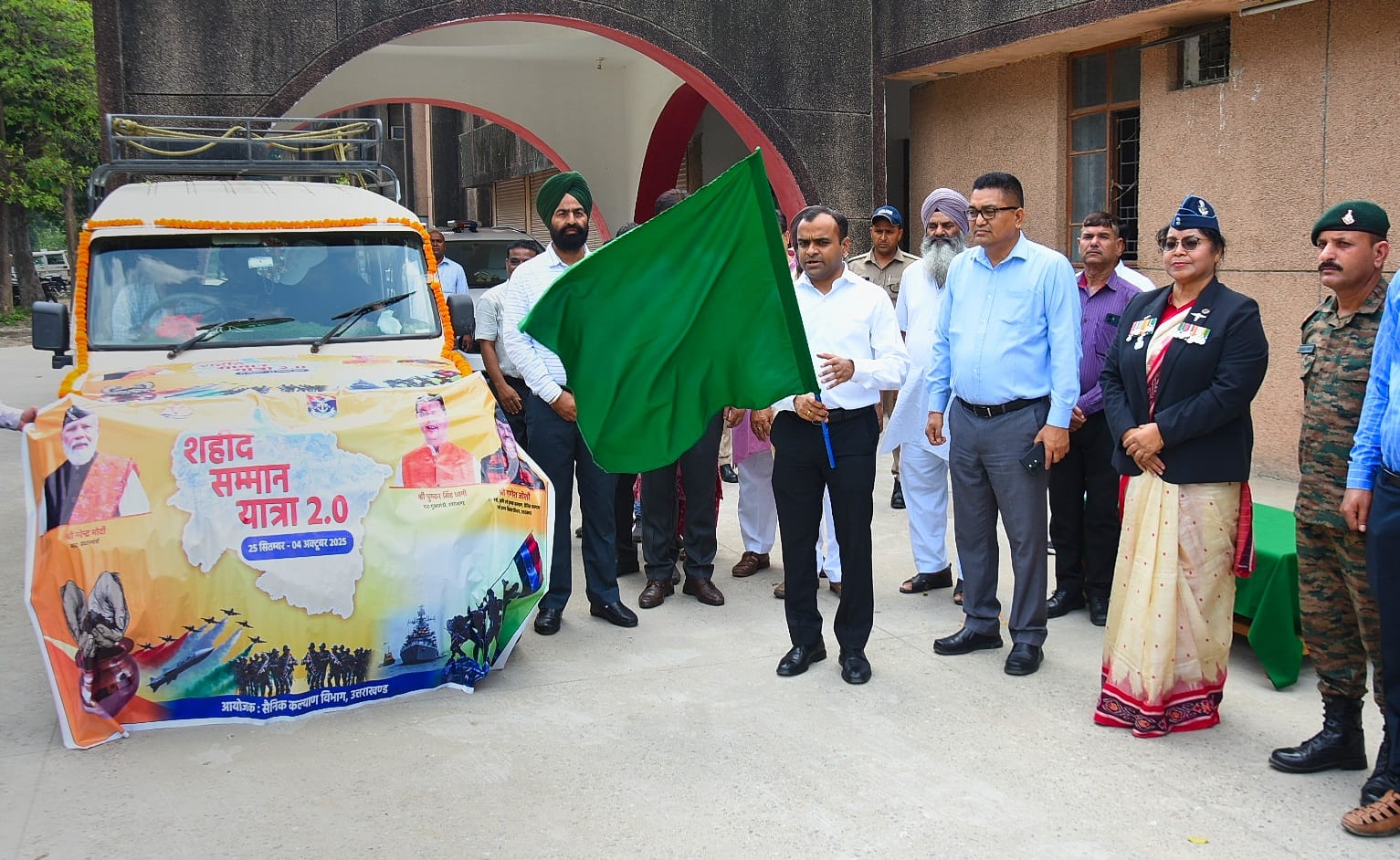 हरिद्वार। जिलाधिकारी मयूर दीक्षित ने जिला मुख्यालय परिसर में शहीद सम्मान यात्रा 2.0′ का फ्लैग ऑफ कर किया रवाना। कार्यक्रम के दौरान जिलाधिकारी मयूर दीक्षित ने कहा कि जनपद के दो शहीद सैनिकों के आश्रितों गीता सैनी शहीद हव० सोनित कुमार सैनी निवासी ग्राम-धनौरा रुड़की एंव कविता चौधरी पत्नी शहीद नायक प्रदीप कुमार निवासी ग्राम-गदरजुडा, मंगलौर, रुड़की को प्रदेश सरकार की तरफ से दिनांक 05 अक्टूबर 2025 को ‘गढ़वाल राईफल्स रेजीमेंट सेन्टर’ लैंसडाउन में ‘शहीद सम्मान समारोह’ का आयोजन किया जा रहा है। उक्त समारोह में मा० मुख्य मंत्री जी द्वारा वीर नारियों/आश्रितों को ताम्रपत्र भेंट कर सम्मानित किया जायेगा। उक्त कार्यक्रम हेतु प्रदेशभर में शहीद सम्मान यात्रा 2.0 की शुरूआत दिनांक 25 सितम्बर 2025 से 04 अक्टूबर 2025 तक की गई, जिसमें शहीद सैनिकों के घर-आंगन की मिटट्टी एकत्रित की गई।उन्होंने कहा कि जिला सैनिक कल्याण कार्यालय द्वारा शहीद सैनिकों के आश्रितों को उनके आवास से विभागीय वाहन के द्वारा रोशनाबाद लाया गया, जहां से ‘फ्लैग आफ’ कार्यक्रम के उपरान्त वीर नारियों एंव उनके आश्रितों को लैंसडाउन के लिये रवाना किया गया।