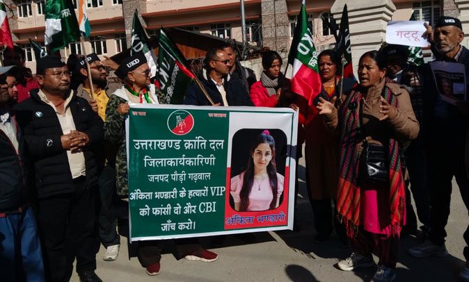 पौड़ी। अंकिता भंडारी हत्याकांड में शामिल तथाकथित वीआईपी पर कार्रवाई करने और पूरे प्रकरण की सीबीआई जांच की मांग के लिए यूकेडी ने जिला मुख्यालय पौड़ी में प्रदर्शन किया। साथ ही उन्होंने प्रदेश सरकार का पुतला जलाया। साथ ही उर्मिला सनावर की सुरक्षा की मांग भी उठाई। मंगलवार को पार्टी की केंद्रीय महिला अध्यक्ष संतोष भंडारी व केंद्रीय उपाध्यक्ष आशुतोष नेगी की अगुवाई में पदाधिकारियों व कार्यकर्ताओं ने कलक्ट्रेट के मुख्य गेट पर प्रदर्शन कर प्रदेश सरकार के खिलाफ जमकर नारेबाजी की। कार्यकर्ताओं को संबोधित करते हुए आशुतोष ने कहा कि उर्मिला सनावर ने सोशल मीडिया पर उस तथाकथित वीआईपी के नाम का सार्वजनिक रूप से नाम उजागर किया है बाजवूद इसके सरकार मामले में चुप्पी साधे हुए है। कहा कि इस पूरे मामले में फिर से सर्वोच्च न्यायालय में समीक्षा याचिका दायर की जाएगी। उन्होंने सरकार की नीतियों को जनविरोधी बताते हुए सभी लोगों से इस सरकार के चेहरे को बेनकाब करने के लिए उनका साथ देने की अपील की। उन्होंने सोशल उर्मिला सनावर की उर्मिला की सुरक्षा की मांग उठाई। चेतावनी दी कि उर्मिला सनावर के साथ कुछ भी गलत हुआ तो यूकेडी सड़कों पर उतरकर उग्र आंदोलन करेगी। इस मौके पर जिलाध्यक्ष अर्जुन नेगी, देवेश डोभाल, बलवंत गुसाईं, जेपी नैनवाल, जवाहर लाल भट्ट, लोकेश बहुगुणा, सरस्वती देवी आदि शामिल रहे।