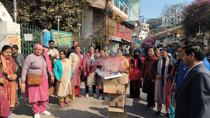 अल्मोड़ा। कैबिनेट मंत्री रेखा आर्य के पति गिरधारी लाल साहू द्वारा की गई कथित अपमानजनक टिप्पणी के विरोध में महिला कांग्रेस ने शनिवार को चौघानपाटा में पुतला दहन किया। इस दौरान महिला कांग्रेस की पदाधिकारियों और कार्यकर्ताओं ने टिप्पणी को महिलाओं के सम्मान पर सीधा हमला बताते हुए कड़ा विरोध दर्ज कराया। पुतला दहन के दौरान महिला कांग्रेस जिलाध्यक्ष राधा बिष्ट ने कहा कि गिरधारी लाल साहू का बयान महिलाओं की गरिमा को ठेस पहुंचाने वाला है और इसे किसी भी स्थिति में स्वीकार नहीं किया जा सकता। उन्होंने कहा कि यदि राज्य सरकार ने जल्द इस मामले में कोई ठोस कार्रवाई नहीं की तो महिला कांग्रेस अपना आंदोलन और अधिक उग्र करने को मजबूर होगी। राधा बिष्ट ने स्पष्ट किया कि महिलाओं के उत्पीड़न और सम्मान के साथ किसी भी प्रकार का खिलवाड़ अब सहन नहीं किया जाएगा। उन्होंने कहा कि महिलाओं के सम्मान और अधिकारों की रक्षा के लिए महिला कांग्रेस पूरी मजबूती के साथ खड़ी है और जरूरत पड़ी तो सड़क से लेकर हर स्तर तक संघर्ष किया जाएगा। पुतला दहन कार्यक्रम में महिला कांग्रेस की लीला जोशी, प्रीती बिष्ट, मंजू कांडपाल, सपना बिष्ट, निर्मला कांडपाल, इंदिरा वर्मा, गीता पांडे, किरण आर्य, उमा आर्य, जया जोशी, आशा शर्मा, शोभा जोशी, लता तिवारी, पुष्पा पांडे, तारा तिवारी सहित अनेक महिला कार्यकर्ता मौजूद रहीं। कार्यक्रम में नगर अध्यक्ष ताराचंद जोशी, नारायण दत्त पांडे, शरद शाह, पारस नाथ, दिनेश नेगी, वैभव पांडे, सुधांशु रौतेला सहित कांग्रेस के अन्य पदाधिकारी और कार्यकर्ता भी शामिल रहे।