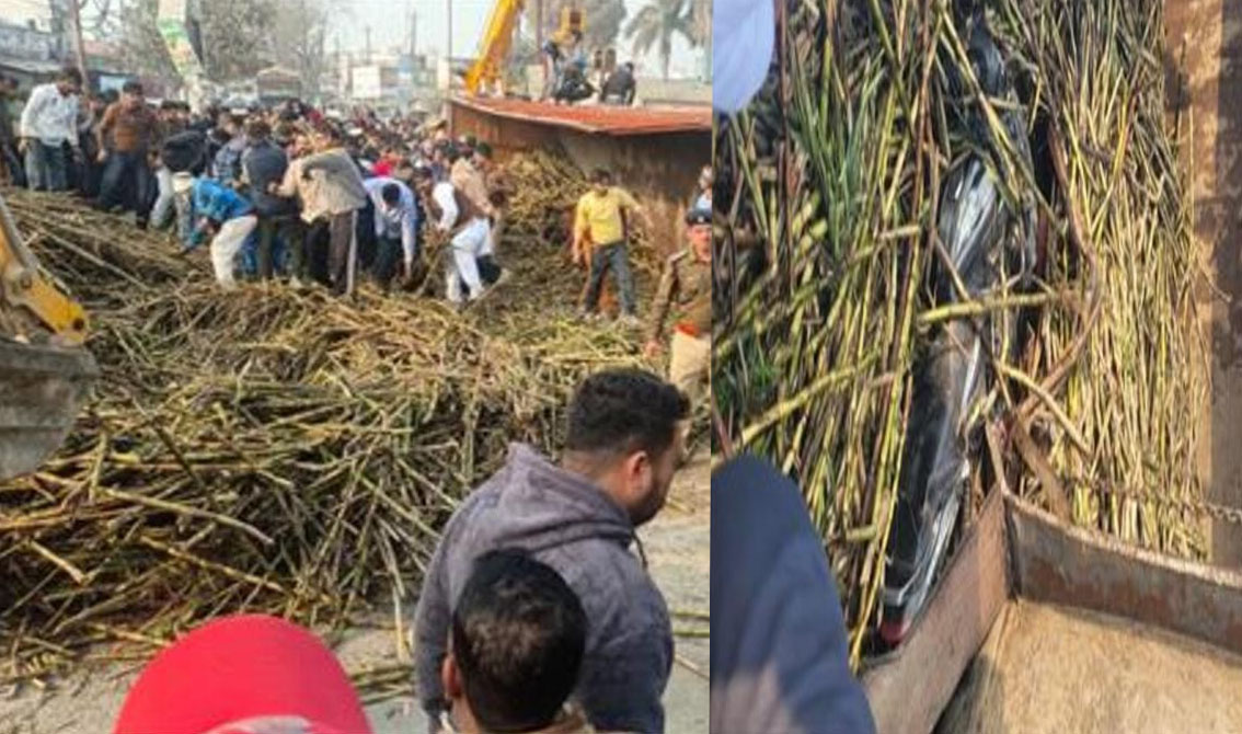 गन्ने का ओवरलोड ट्रक पलटने से बाइक सवार दो युवक घायल