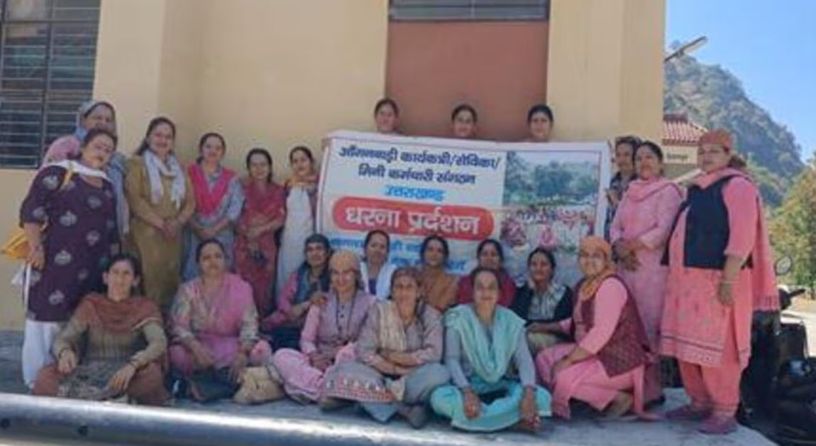 मांगों को लेकर आंगनबाड़ी कार्यकर्ताओं ने दिया धरना